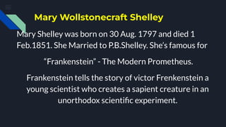 Shelley made history with this book and it is often. MARY SHELLEY and a new interest in science - She was born in 1797. View frankenstein-by-mary-shelley-william-frankenstein-death-analysispdf from LITERACY 117 at University of Notre Dame.